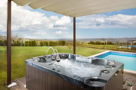Wenn Sie nach draußen treten, lockt das Äußere der Villa Star mit seinem Charme. Umgeben vom üppigen Grün der Weinberge, sind die Außenbereiche der Villa eine Symphonie der Ruhe. Ein gepflegter Garten lädt zum Sonnenbaden ein, während ein privater Swimmingpool mit luxuriösem Jacuzzi an warmen Tagen eine erfrischende Abkühlung bietet. Genießen Sie Ihre Mahlzeiten im Freien in den Sitzbereichen der Villa, wo die sanfte Brise den Duft der Natur herüberträgt und jeden Moment in dieser idyllischen Umgebung verschönert.