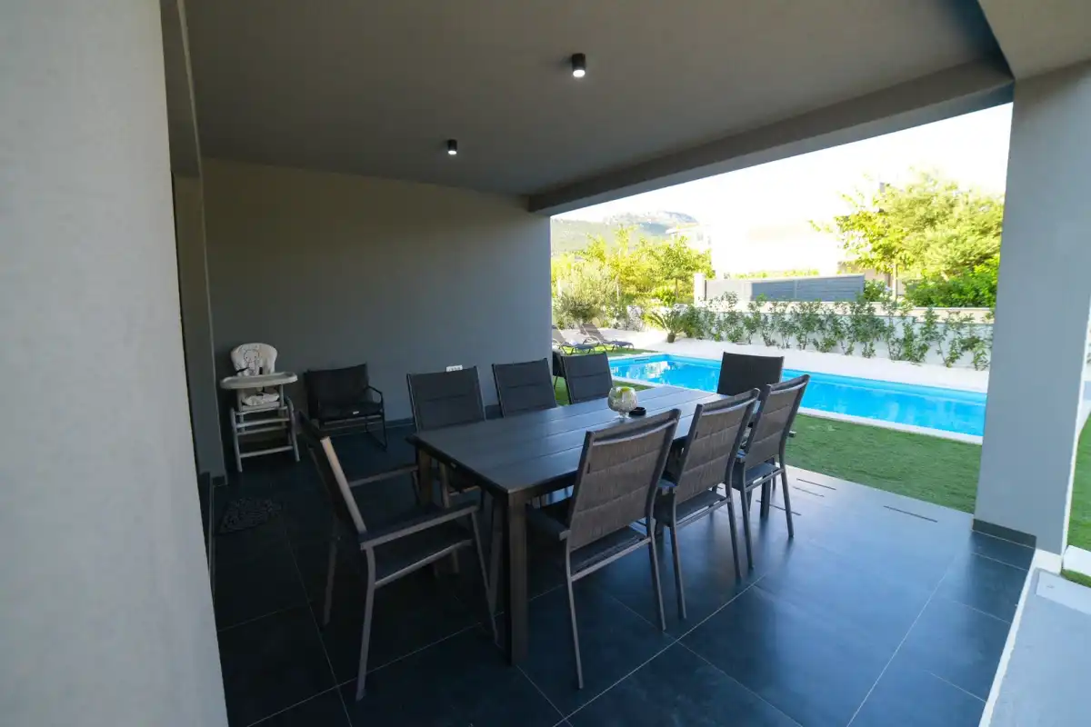 Located in a peaceful part of Kaštel Novi, just 900 meters from Gabine Beach, Villa Valentina offers the perfect combination of comfort, space, and privacy for up to 10 guests. This spacious 320 m² villa features five air-conditioned bedrooms, a private pool, and a contemporary interior ideal for a family holiday or a relaxing getaway with friends, with easy access to Trogir, Split, and the airport. An additional advantage is that the villa is pet-friendly, so your furry companions are welcome for an extra fee of €10 per day.